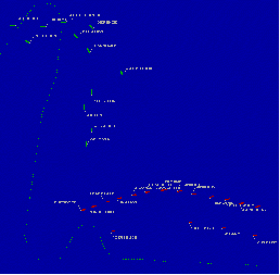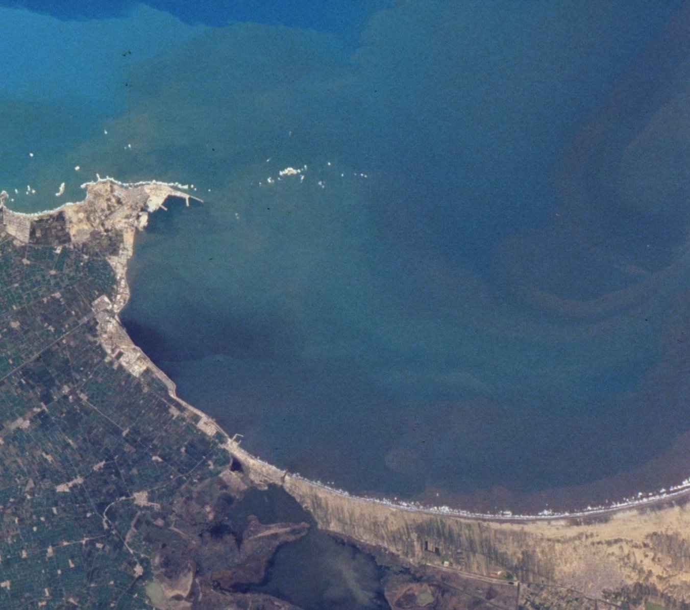 Aboukir Bay - as seen from space (NASA image) and by the computer screen. Nelson's fleet approaches from the top left, rounding the shallows shown by the line of small islands and turning inshore to attack the French fleet. Click on the computer map for a detailed view of the ship's positions as Nelson starts his attack.